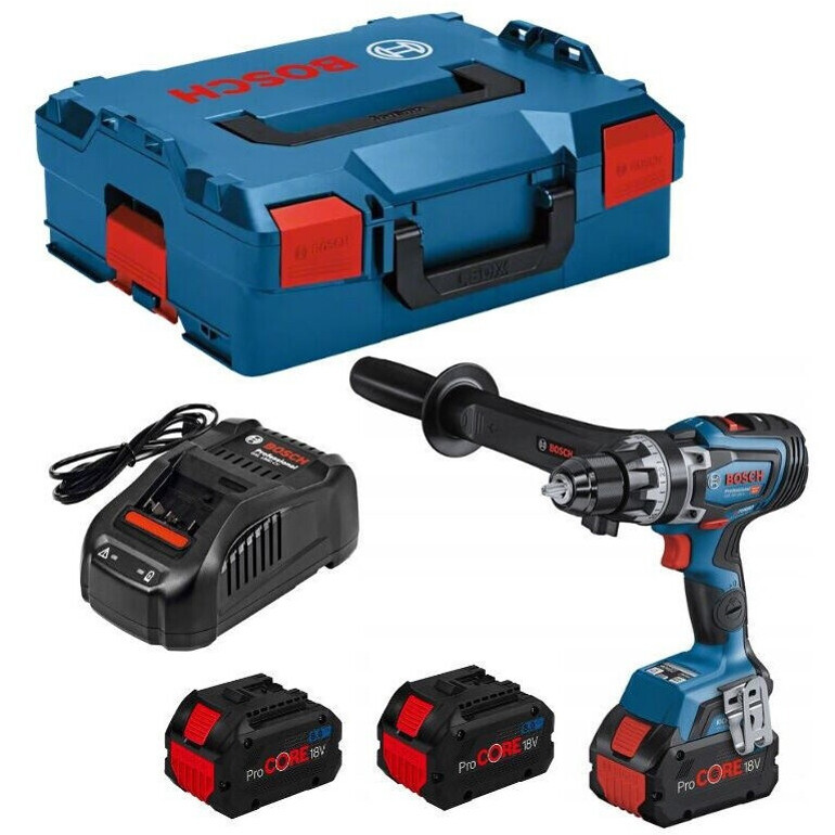 Im Lieferumfang des Bosch GSR 18V-150 C Professional sind zwei 18V Li-Ion Akkus mit jeweils 8 Ah Kapazität, ein Ladegerät und eine L-Boxx enthalten.