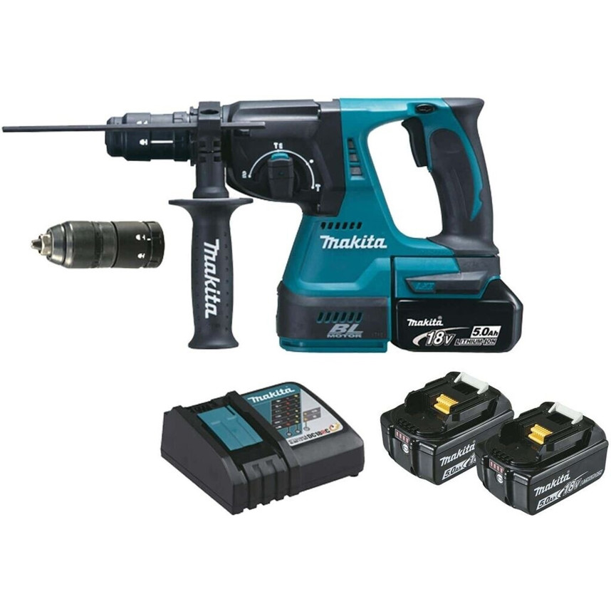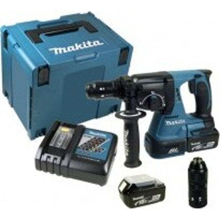 Der Lieferumfang umfasst den Akku-Kombihammer, zwei 18 V / 5 Ah Li-ion Akkus, ein Ladegerät, einen Tiefenanschlag, ein Bohrfutter sowie einen Makpac 2 Werkzeugkoffer.